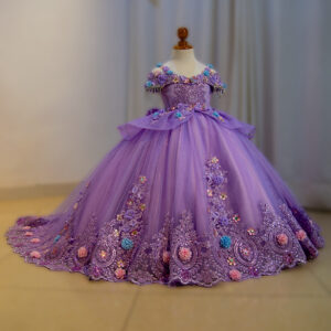Vestido de 15 años color lila en corset con mangas caídas y guipur de flores rosas