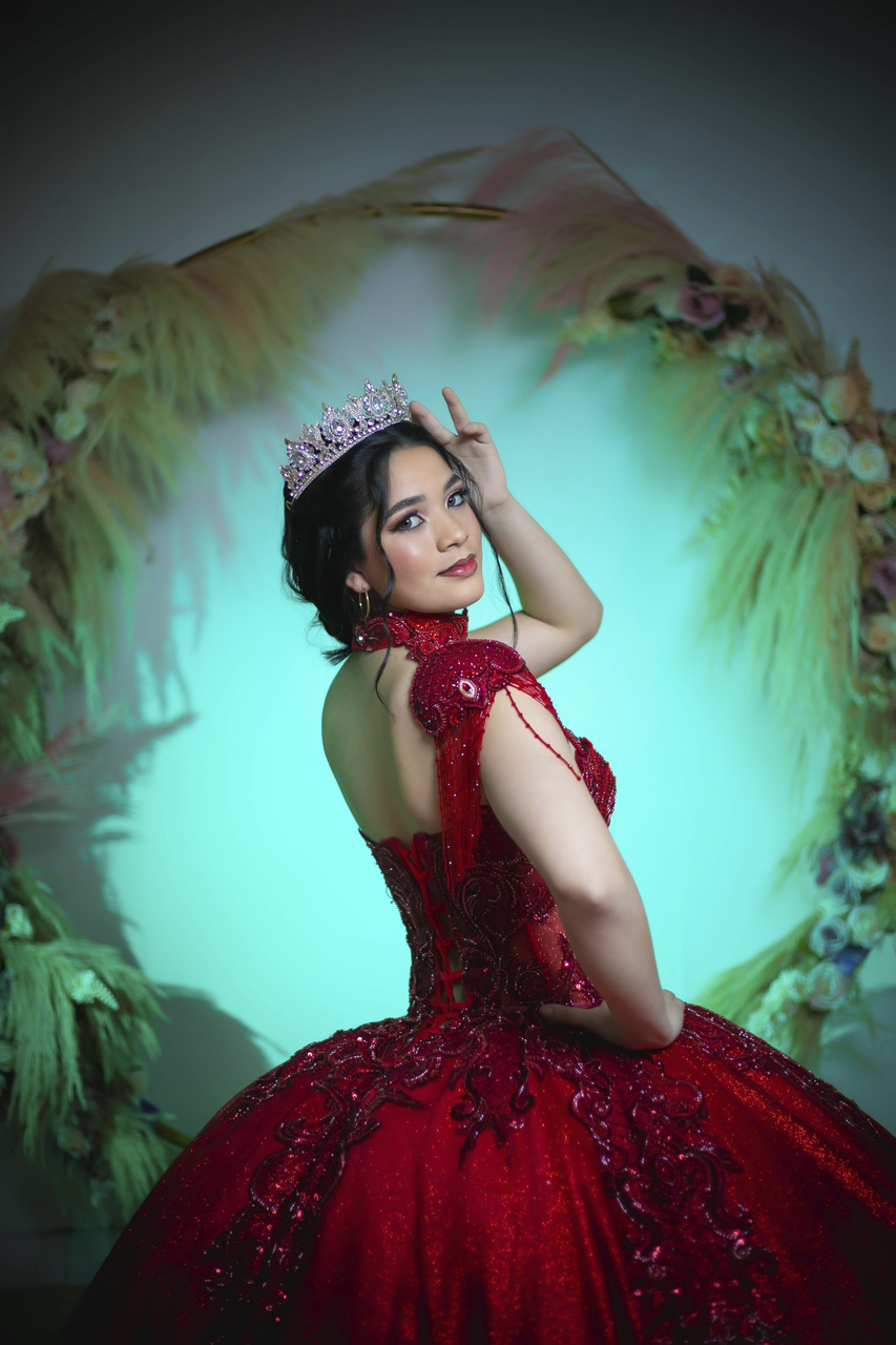 Vestido en color rojo colorado, con pechera en transparencia y guipur de full pedrería rojo, acompañado de full pedrería fina roja. En la espalda es corset para mayor ajuste al cuerpo, acompañado de un bustier copa normal con transparencia. Tiene adorno de hombrera de un solo brazo con chorreras de pedrería roja y junto a ello un collarín de modelo chocket adornado de más pedrería roja. La falda en color rojo colorado, elaborada en tul nieve y adornado con guipur de pedrería rojo y una cuña de 1.5 m de largo.