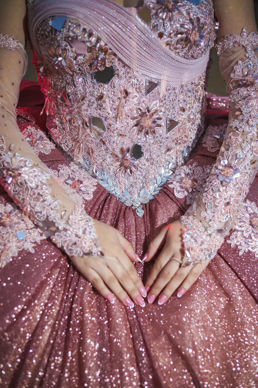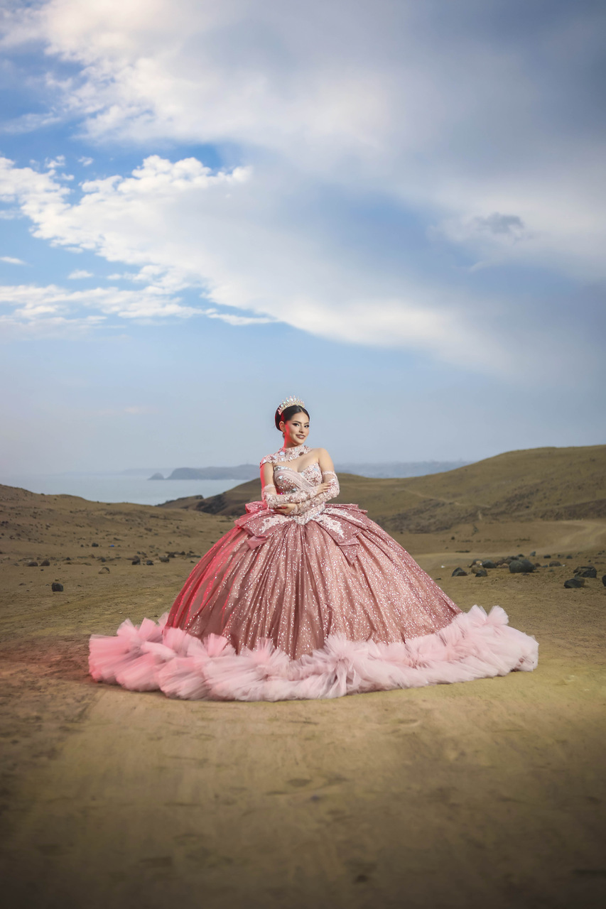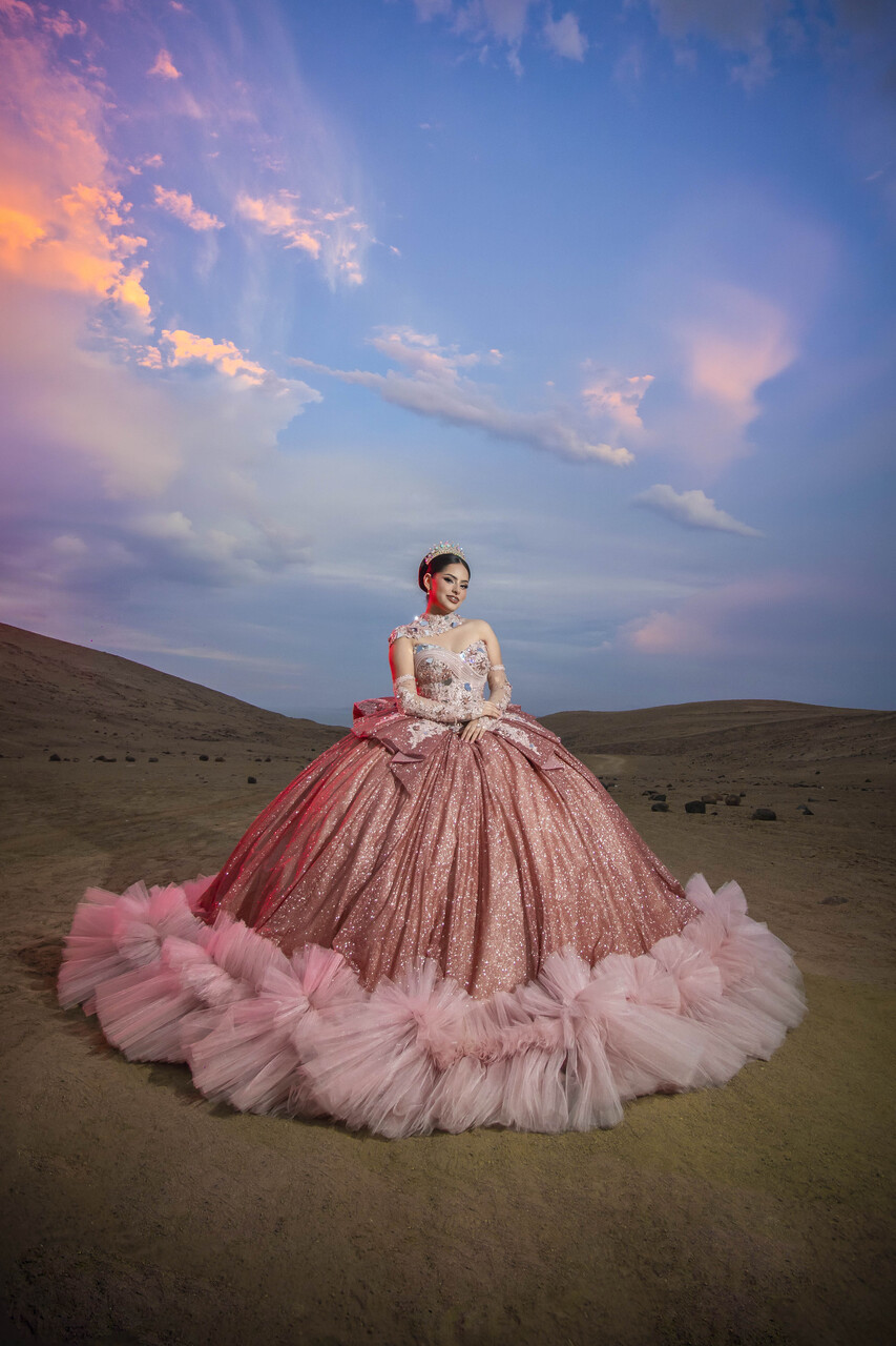 Vestido de quinceañera princesa en tono palo rosa empolvado, elaborado en alta costura con un acabado brillante que realza su presencia. El corset estructurado con escote corazón está bordado con pedrería, cristales, aplicaciones florales en relieve y detalles tipo espejo que aportan luz y dimensión. El diseño se complementa con cuello alto tipo joya, mangas tipo guante en tul ilusión y una falda amplia tipo princesa con volumen estructurado. La sobrefalda posterior, el lazo en cintura, la espalda con ajuste tipo corsetería y el borde inferior de tul voluminoso completan un acabado elegante, imponente y sofisticado.