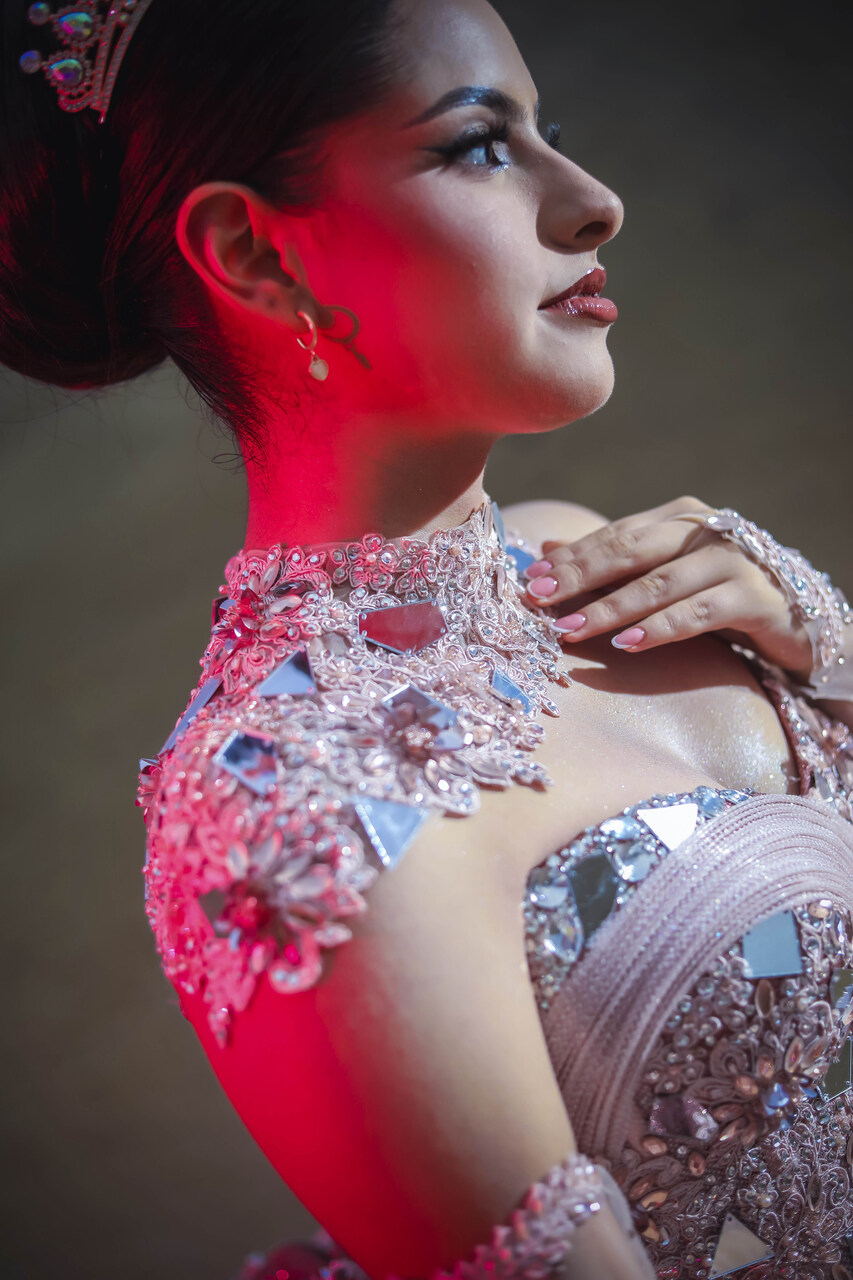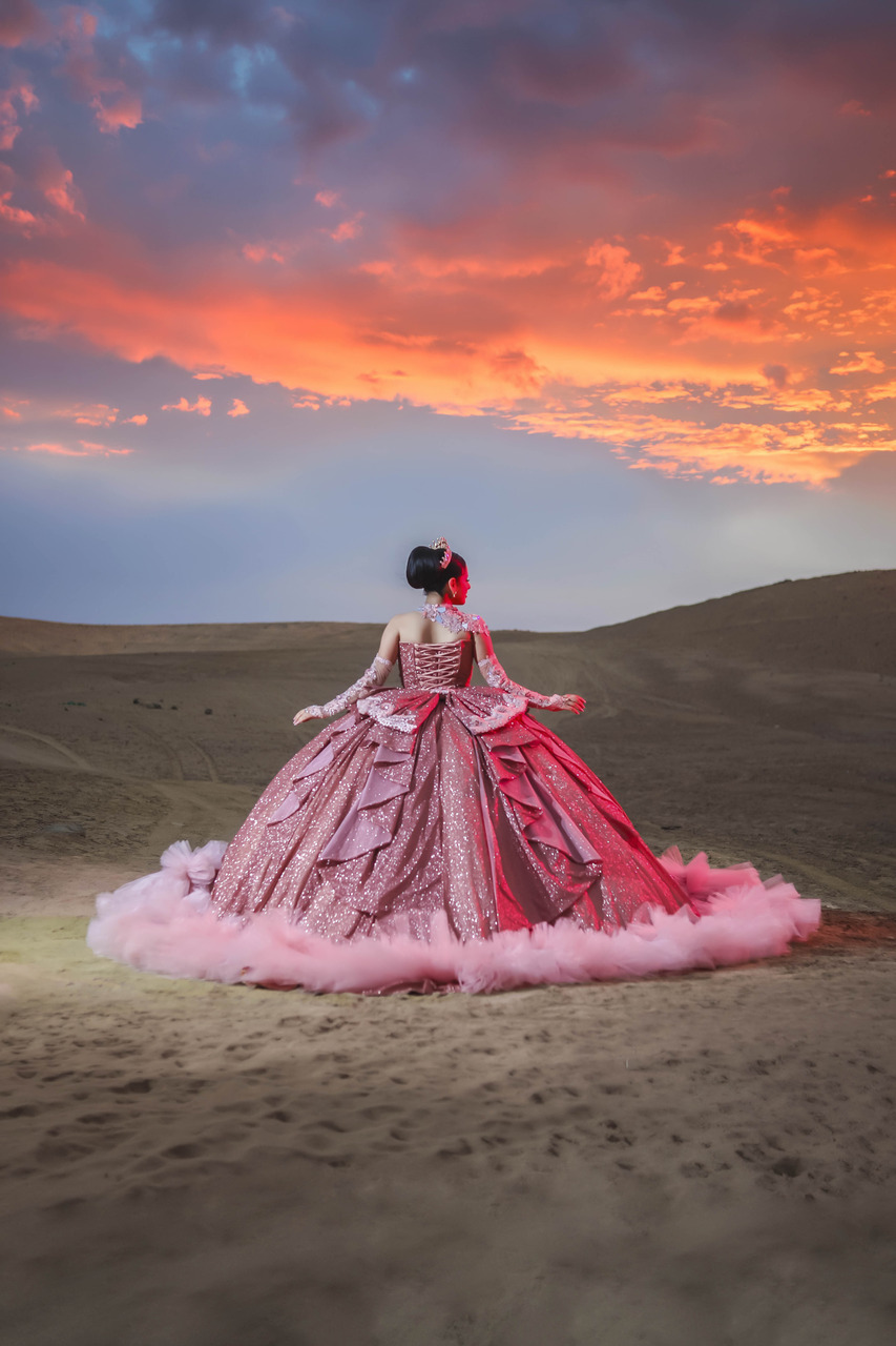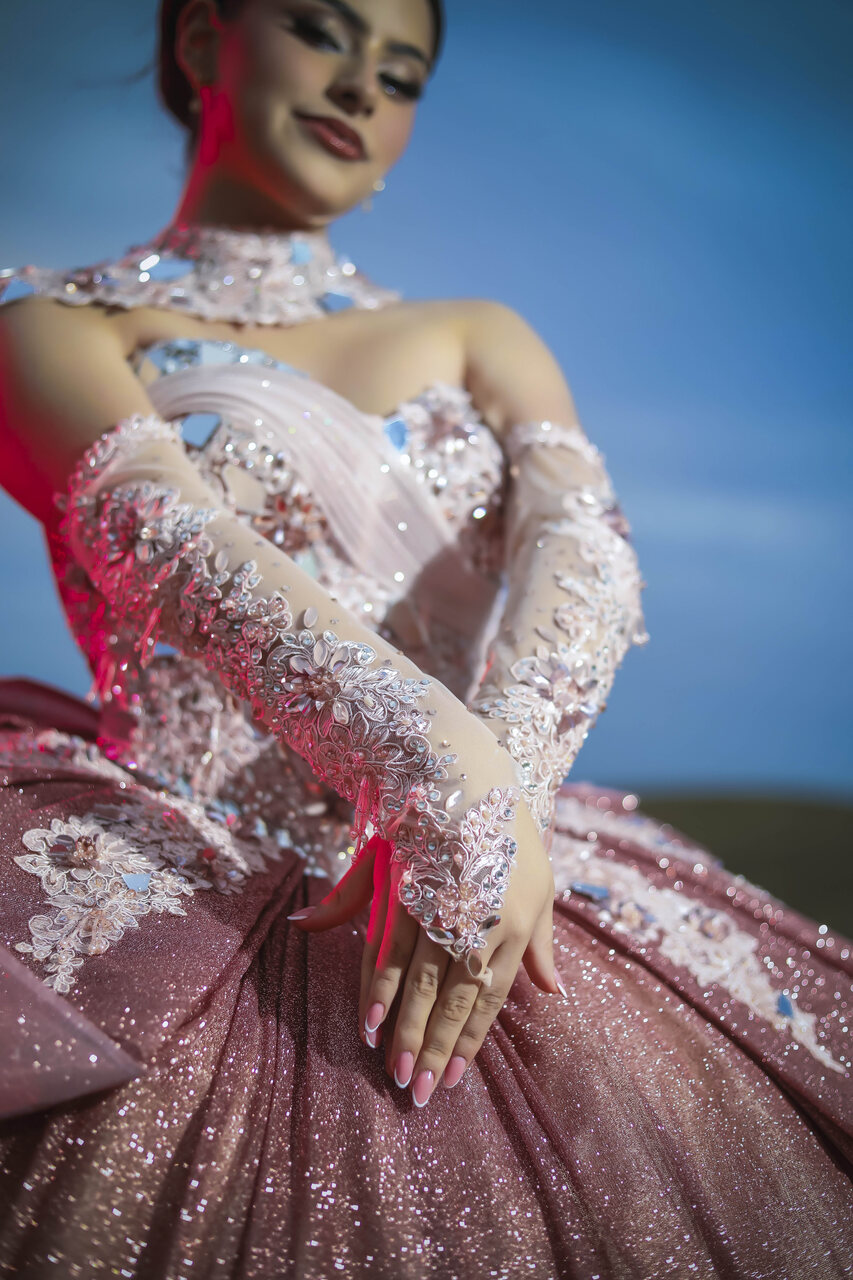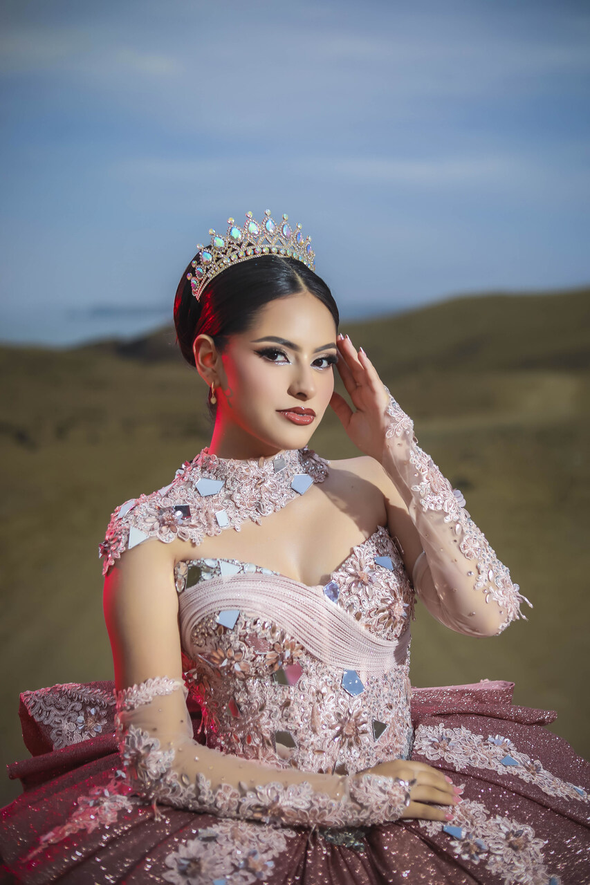 Vestido de quinceañera princesa en tono palo rosa empolvado, elaborado en alta costura con un acabado brillante que realza su presencia. El corset estructurado con escote corazón está bordado con pedrería, cristales, aplicaciones florales en relieve y detalles tipo espejo que aportan luz y dimensión. El diseño se complementa con cuello alto tipo joya, mangas tipo guante en tul ilusión y una falda amplia tipo princesa con volumen estructurado. La sobrefalda posterior, el lazo en cintura, la espalda con ajuste tipo corsetería y el borde inferior de tul voluminoso completan un acabado elegante, imponente y sofisticado.